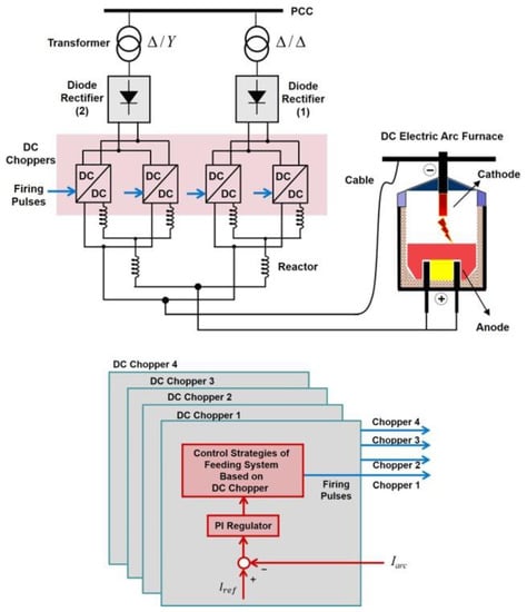 The structure of a DC arc furnace with a feeding system based on diode rectifiers and DC choppers.