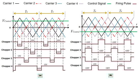 This method is similar to the SC-PWM method, with the difference that instead of using a triangular carrier signal, we will have triangular carrier signals that have a phase shift relative to each other in the number of units. Therefore, in this research, the number of carrier signals will be four. Each of these carrier signals is specific to one of the available chopper units. Figure 6 shows the triangular carrier signals with proper phase transition and the corresponding chopper units.