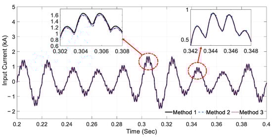 Figure 8 shows the total input current on the AC side in the above three control methods. These currents have been obtained for a constant duty cycle of D = 0.8. It is clear that in PWM methods, in conditions where the maximum value of the carrier wave is equal to one, a duty cycle of D = 0.8 is provided for VControl = 0.6. As can be seen, these methods have relatively similar behavior from the point of view of the AC network. The similarity in the absorbed currents from the network in these three methods acknowledges that the power quality effects in the network are almost similar to each other.