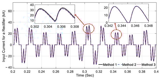 Figure 9 shows the input current of one of the rectifiers in the three mentioned methods with the duty cycle of D = 0.8. As can be seen, the results of these three methods have slight deviations from each other.
