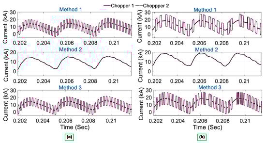 The input currents of chopper units 1 and 2 are shown in Figure 10a for the three discussed methods. In this case, the duty cycle of choppers is the same and equal to 0.8. As can be seen in this figure, the current waveforms of the chopper units in the first and third methods have many fluctuations. Figure 10b shows the input currents of chopper units 1 and 2 using a DC electric arc furnace with the CCC method in the three mentioned methods.