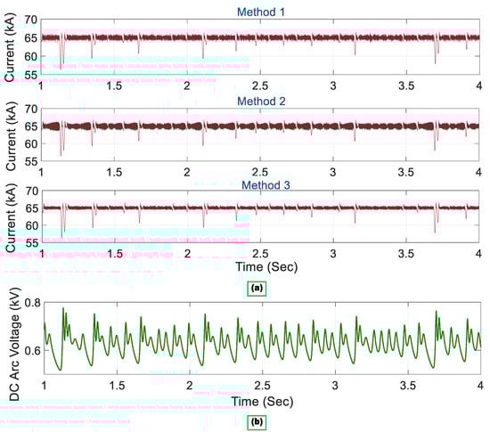 (a) DC electric arc current to control the constant current of the arc furnace in the three discussed methods; (b) DC arc voltage.
