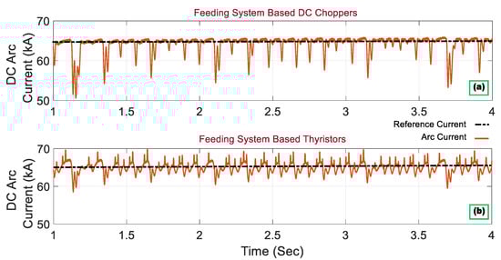 Figure 12 shows the DC arc current of the feeding system based on the diode rectifiers with DC choppers and the thyristor rectifiers. The current reference is considered equal to 65 kA, and the CCC control is applied to the studied DC electric arc furnace. The results show that the chopper feeding system will result in a lower deviation compared to the reference value.