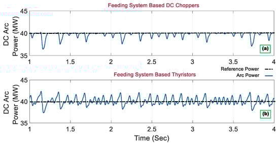 Similarly, Figure 13 shows the arc power when applying the CPC method on the electric arc furnace feeding system based on the diode rectifiers with DC choppers and the thyristor rectifiers. For this purpose, Equation (20) was utilized. The power reference is considered equal to 40 MW. As can be seen in this figure, the convergence to the reference value is much more favorable in the chopper feeding system than in the thyristor feeding system.