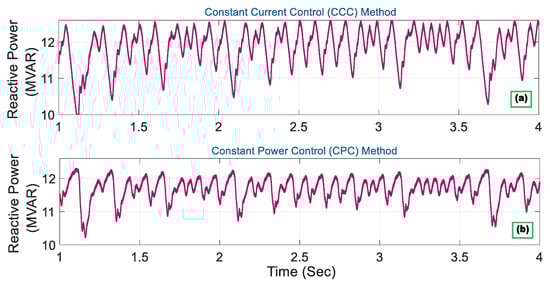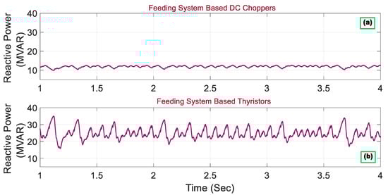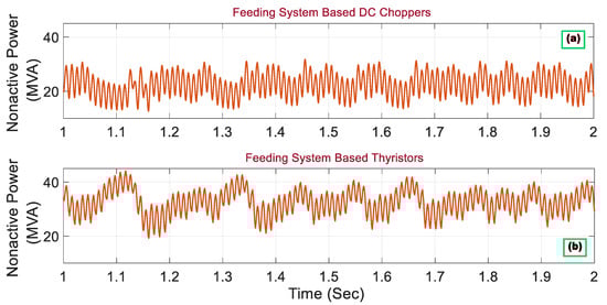Figure 14 illustrates the reactive power absorbed from the network using these two different feeding systems based on chopper units and thyristor power supply systems. For this purpose, Equation (20) was utilized. As can be seen, the reactive power consumption has been significantly reduced in the feeding system based on the diode rectifiers with DC choppers. In addition, the reactive power fluctuations in the DC choppers power supply system are much less than the fluctuations of reactive power in the case of the thyristor power supply system. In fact, due to the high switching frequency of the chopper units, tracking the arc voltage fluctuations is performed faster. As a result, the active and reactive powers in this system have more uniformity and fewer fluctuations.