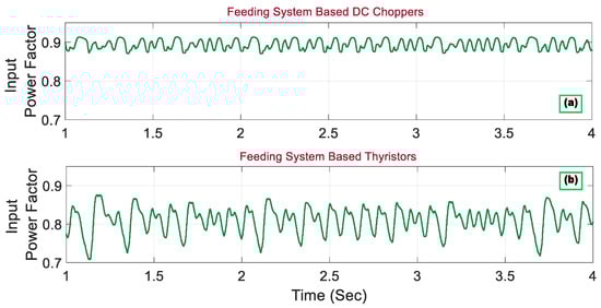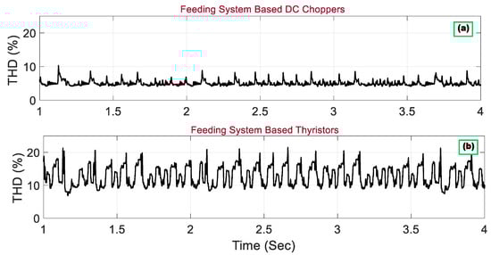 In this part, the effect of the introduced conventional feeding systems, shown in Figure 1 and Figure 4, on various power quality indexes are investigated. The utilized parameters are similar to Section 5.1. Due to the advantages of the PWM control method with given phase-shifted carriers, this control method has been used in the feeding system based on DC choppers.
