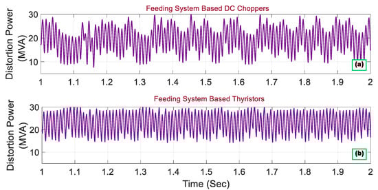 In Figure 17 and Figure 18, the non-active power (N) and the distortion power (D) are shown for the two different feeding systems based on chopper units and thyristor power supply systems. For this purpose, Equations (22) and (19) were utilized, respectively. The CCC method was applied to both feeding systems. As can be seen, in the case of the chopper power supply system, the non-active and distortion powers have smaller values than the thyristor power supply system.