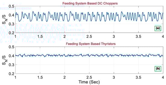 The non-fundamental apparent power SN is related to the amount of harmonic distortion, and the SN/S ratio is a suitable index to compare the amount of harmonic distortion created in different states of the power supply system [21]. Figure 19 shows the SN/S index for the CCC method applied to the two different feeding systems based on chopper units and thyristor power supply systems. For this purpose, Equations (18) and (19) were used. As can be seen, the average value of this index in the case of the chopper feeding system is lower than its average value in the case of the thyristor feeding system. This indicates that the harmonic distortion is less in the case of the chopper feeding system and is consistent with the result obtained from Figure 16.