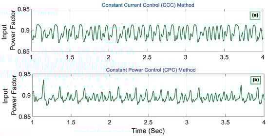 On the other hand, multiple chopper units ensure a balanced power distribution between diode rectifiers, and current control loops are also used for equal current distribution between chopper units. In addition, the balance of the current between the secondary of the transformers causes the elimination and weakening of the low-order harmonics. Therefore, the amount of absorbed reactive power and its fluctuations are reduced in this type of power supply system. As a result, there is no need for harmonic filters and reactive power compensation devices on the chopper side. Since reactive power fluctuations have a direct relationship with voltage fluctuations and consequently with the flicker intensity, it can be said that the flicker intensity is less in the case of a chopper power supply. Due to the significant reduction in the absorbed reactive power in the chopper power supply system, it is expected that the input power factor has also improved in this case. This is shown in Figure 15 for the CCC method applied to the studied electric arc furnace. For this purpose, Equation (27) was utilized.