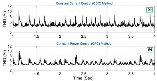 The THD of the input current is shown in Figure 16 for the CCC method applied to the studied DC arc furnace system. It is clear that the THD was significantly reduced when using the power supply system based on chopper units.