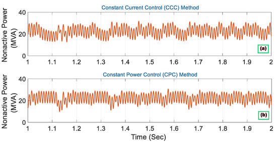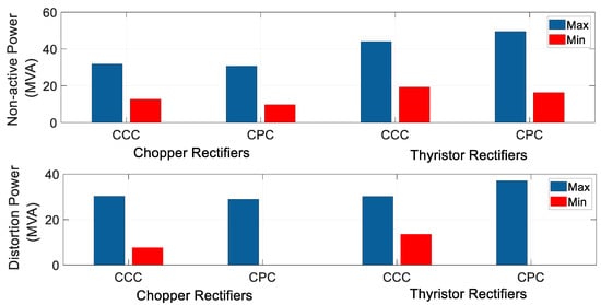 In Figure 26, a comparison of non-active power and distortion power in the DC arc furnace system for chopper rectifiers and thyristor rectifiers is presented with CCC and CPC control methods. As shown in Figure 26, the maximum non-active power was reduced from 49.5 MVA in thyristor rectifiers to 30.7 MVA in chopper rectifiers with the CPC method. For the CCC method, the maximum non-active power was reduced from 44.1 MVA in thyristor rectifier to 31.8 MVA in chopper rectifiers. Furthermore, the maximum distortion power was reduced from 37.1 MVA in thyristor rectifiers to 29 MVA in chopper rectifiers with the CPC method. The results are similar to the CCC method.