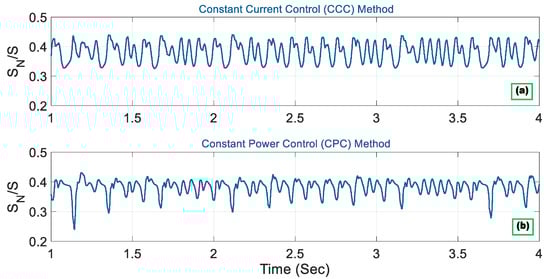 Figure 25 presents the SN/S index in the two control methods of CCC and CPC for the power supply system based on chopper rectifiers. As can be seen, the average value of this index in the CPC method is lower than its average value in the CCC method. Moreover, in the CPC method, the maximum values of the SN/S index are lower. This indicates that the harmonic distortion is less in the CPC method and is consistent with the result obtained from Figure 22.