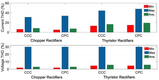 In Table 1 and Figure 27, a comparison of input current THD and input voltage THD of the AC side in the DC arc furnace system for chopper rectifiers and thyristor rectifiers is provided with CCC and CPC control methods. As shown in Figure 27, the average current THD is reduced from 16.55% in the thyristor rectifiers to 8.40% in the chopper rectifiers with the CCC method and from 19.27% in the thyristor rectifiers to 7.38% in the chopper rectifiers with the CPC method. Moreover, the average voltage THD is reduced from 5.67% in the thyristor rectifier to 3.02% in the chopper rectifiers with the CCC method. The result is similar to the CPC method.