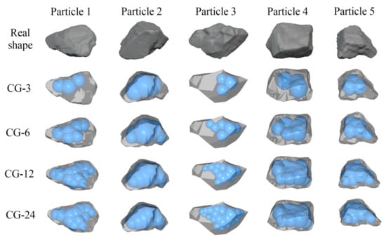Due to the shape and size polydispersity of quartz sands, it is easy to imagine that a significant amount of work is required to obtain the shape for every sand particle used in the above experiment. Therefore, a reasonable simplification was carried out, whereby only five particle types with different shapes and sizes were selected to represent the particulate system of the quartz sands in the DEM simulations; the geometries of the sand particles were extracted using a 3D scanner. In addition, some properties used in quantifying the geometry of these selected particles are listed in Table 1, and their geometries are presented in Figure 1, Figure 2 and Figure 3.