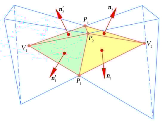 where Ai and ni are the area and the corresponding outward unit normal vector of the plane belonging to the aforementioned polyhedron block, respectively. Taking vertex–vertex contact as an example, the polyhedral block V2P1P2P3 is formed between particles, as illustrated in Figure 4. According to the plane areas of A1, A2, and A3 and the corresponding outward unit normal vectors of n1, n2, and n3, Equation (3) can be rewritten as
