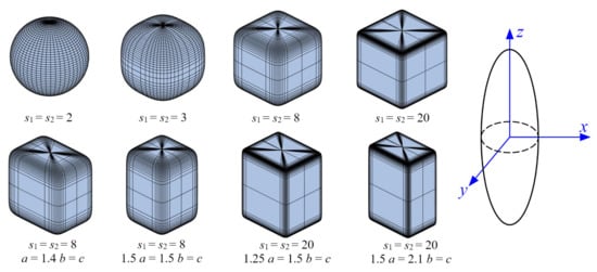 - Barr, A.H. Superquadrics and angle-preserving transformations. IEEE Comput. Graph. Appl. 1981, 1, 11–23. [Google Scholar] [CrossRef]