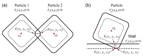 in which the target function is to search the deepest point, and the constraint condition guarantees that the deepest point is on the particle surface. Then, Equation (6) can be solved using the Lagrange multiplier method. The contact between the particle and wall (see Figure 6b) can be solved similarly to that between super-ellipsoids, whereby Equation (6) can be rewritten as