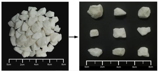 Before the experiment, the particles were first loaded into the hopper, and the upper surface of the particle pile was subsequently leveled. A baffle was placed at the outlet of the hopper to prevent the particles from falling out of the hopper. Then, the stepper motor was turned on with a rotation speed of 8 rpm. Subsequently, the experiment began when the baffle at the hopper outlet was rapidly removed, whereby the particles fell freely under the action of gravity. The falling particles sequentially flowed through the drop tube, rotating chute, and cylindrical container. According to the purpose of this paper, the particle shape and its approximation were more important than other particle properties. Therefore, the particles used in the experiment were quartz sands with a shape similar to the coke and ores used in a real BF, as illustrated in Figure 8.