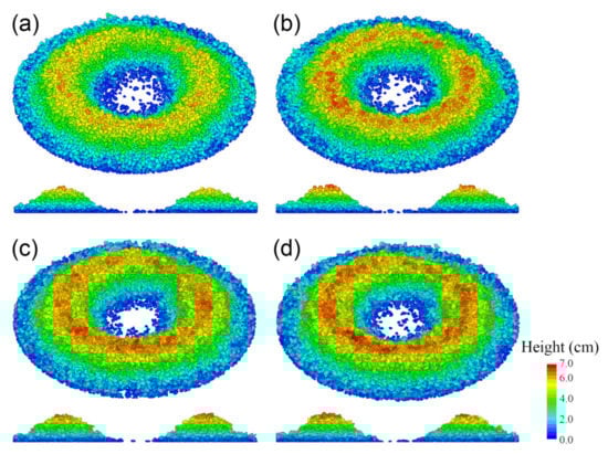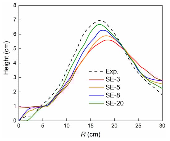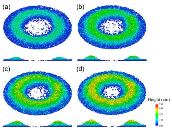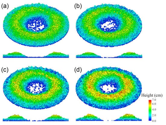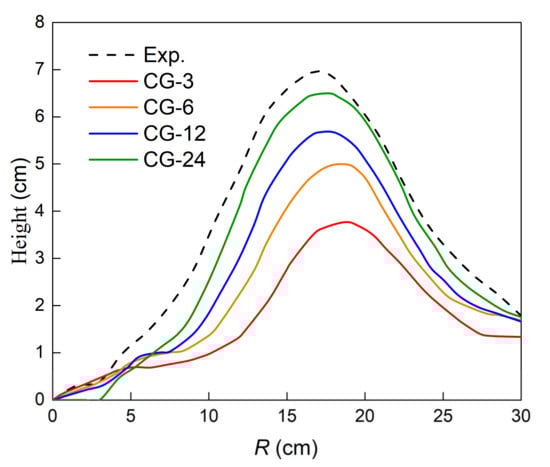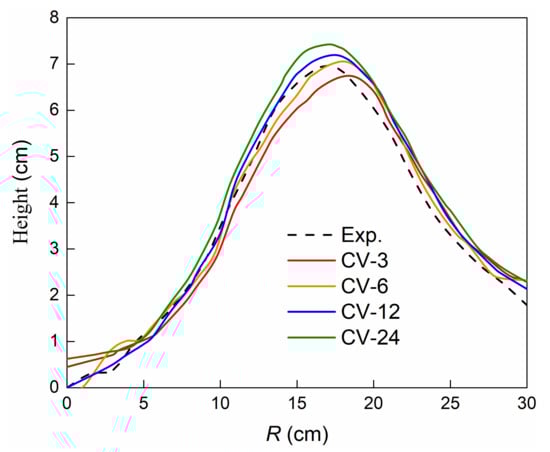 Moreover, the heap top position for CV-24 possessing the highest number of sub-spheres in this paper was most consistent with the experiment, as illustrated in Figure 13. Nevertheless, the surface profile of CV-6 agreed best with the experiment. This could be attributed to the principle of the control volume mode, wherein the sub-spheres could guarantee a comparable volume between the multi-sphere and real particle. This phenomenon became more prominent with the increase in the number of sub-spheres. Therefore, the contour of the multi-sphere particles was larger than that of the real particles, leading to a higher surface pile height for multi-sphere particles formed by more sub-spheres.