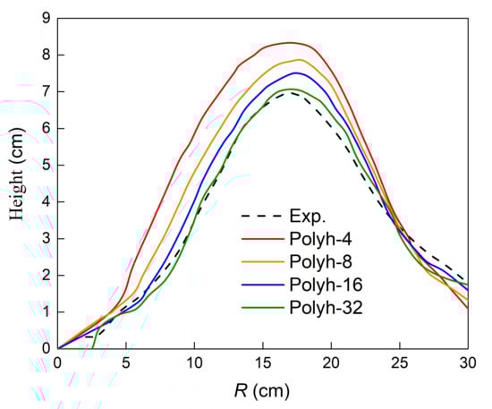 In this section, the simulation results using the polyhedral DEM model are compared with the experimental results. The burden piles for polyhedral particles approximated by four, eight, 16, and 32 planes are shown in Figure 14, and their surface piles are plotted in Figure 15. According to these two figures, the heap top height decreased when using more planes, and the heap top position approached the furnace center upon increasing the number of planes from eight to 32. Overall, using more planes could improve the simulation accuracy, whereby the burden morphology for Polyh-32 was most consistent with the experiment. The measurement results of the heap top height are listed in Table 6. It can be found that there was an error of 19.8% between the experiment and simulation for Polyh-4, whereas the error was only 1.4% for Polyh-32.