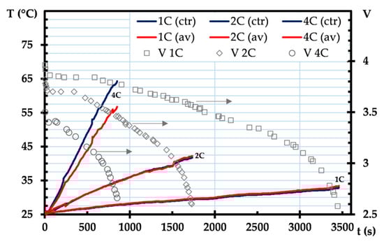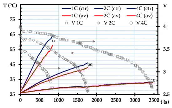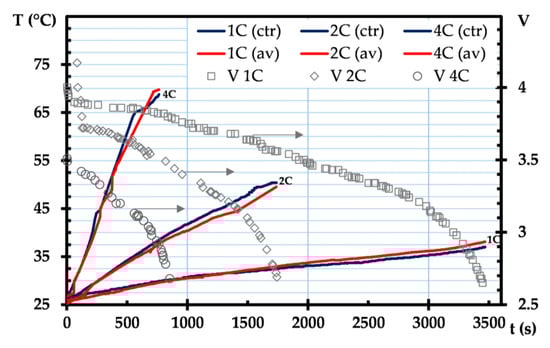 Figure 4 shows the typical temperature profiles and voltage depletion over time in a module casing made of pure resin, which can be used as a reference for further analysis. The so-called one C-rate corresponds to the discharge current such that a fully charged battery voltage reaches its cut-off in one hour, whereas 4 C indicates that the battery will be completely discharged in about 15 min. Considering that the heat dissipation is proportional to the square of the discharge currents (Equation (4)), it can be seen that for 1 C, 2 C, and 4 C discharge rates, the average cathode temperatures might increase to 38 °C, 50 °C, and 71 °C, respectively. Overall, there was no notable variation in temperature between the center cell temperature and the average temperature, which suggests that heat dissipation was very uniform during the discharge operation.