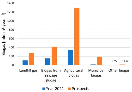 The largest increment in energy production from biogas, based on the estimation in relation to the state from 2021, was reported for municipal biogas, where a 12-fold increase in electricity and a 13-fold increase in heat production were reported. In terms of quantity, the greatest value of energy can be produced from agricultural biogas, which for electricity accounts for 45.7% of the total electricity and 42.7% of heat. This is a significant volume of energy in the entire energy balance of biogas.