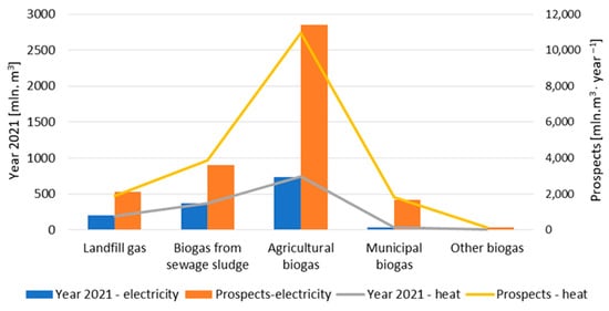 The performed estimation of the technical potential of biogas that can be produced in Poland is more than three times higher compared to the amount of biogas used in 2012. In the prepared biogas balance, the highest estimated increase was recorded for municipal biogas, demonstrating a larger than 12-fold increment as compared to that from 2021. Additionally, the smallest increase was estimated for landfill biogas, which demonstrated a larger than 2.5-fold increment, which is related to the gradual elimination of biogas activity of landfills. In terms of quantity, the largest share is reported for agricultural biogas, with an estimated amount of 1295.61 mln m3 of biogas able to be produced. The estimated amount of electricity and heat able to be produced in cogeneration units compared to the current state in Poland is shown in Figure 3.