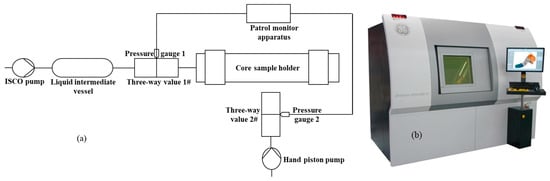 The experiment consists of two main stages: water invasion and CT scanning; the schematic diagrams of the water invasion experiment equipment and the CT scanning machine are shown in Figure 2. The liquid intermediate vessel is connected to the ISCO pump to provide the pressure, and the two core holders are connected in parallel to ensure that the same pressure is applied to the two core samples under the force of water during the water invasion. The patrol monitor apparatus is connected to the water invasion end of the core holder to monitor the pressure during the water invasion, and the hand piston pump is connected to the side end of the core holder to provide a stable confining pressure that is used to simulate the formation pressure in the shale gas reservoir. The experimental temperature was room temperature and the experimental pressure was 40 MPa.