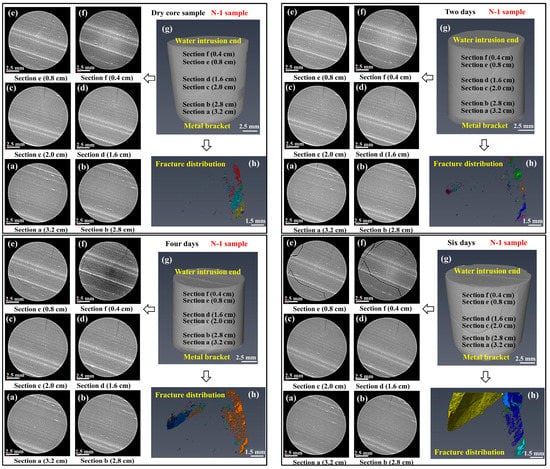 The CT images of the two-dimensional and three-dimensional pore-fracture systems in the N-1 sample before water invasion and after two, four, and six days of water invasion. (a–f) Two-dimensional section of different positions from the water intrusion end; (g) three-dimensional CT reconstruction of core sample; (h) three-dimensional pore-fracture system.