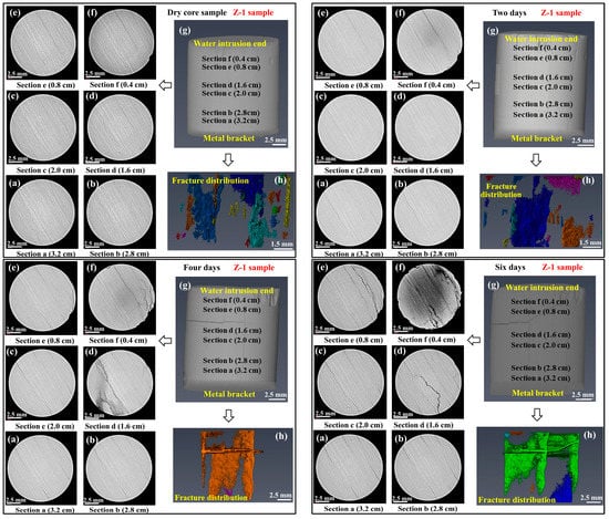 The CT images of the two-dimensional and three-dimensional pore-fractures system in the Z-1 sample before water invasion and after two, four, and six days of water invasion. (a–f) Two-dimensional section of different positions from the water intrusion end; (g) three-dimensional CT reconstruction of core sample; (h) three-dimensional pore-fracture system.