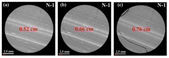The Avizo software, a professional graphic visual software, can be used to obtain the CT scanning results of the pore-fracture structure in different experimental stages to study the fracture propagation rule. Figure 3 and Figure 4 show the two-dimensional section of different positions from the water intrusion end and the three-dimensional CT reconstruction and pore-fracture system before water invasion and after two, four, and six days of water invasion in the N-1 and Z-1 shale samples.