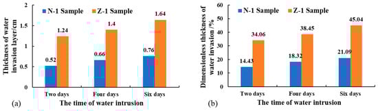 Compared with the N-1 and Z-1 shale samples before and after water invasion in Figure 3 and Figure 4, and the positions of the water invasion front in Figure 5 and Figure 6, it can be seen that the primary fractures were more developed and the width of the fractures increased, and more secondary fractures were developed at the water invasion end of the core sample after water invasion. The thickness of the water invasion layer increases with the time of water intrusion. Although the thickness of the water invasion obtained by the experiment is only centimeter-level, it can be seen from the dimensionless thickness of the water invasion that 15–45% of the core sample is affected by water invasion in Figure 7. Compared with the N-1 shale sample, the Z-1 shale sample is shallower in depth and has higher fracture development. After water invasion, the primary and secondary fractures are more developed, the rock damage at the water invasion end is more serious, and the water invasion layer is thicker. This is mainly due to the fact that deep shale has a tighter matrix and lower permeability, so the penetration depth of the fracturing fluid is smaller, the thickness of the water invasion layer is smaller, and the fracture propagation and microfracture generation are more difficult.