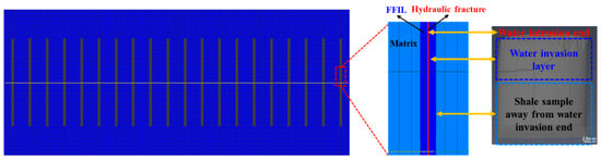 Laboratory experiments show that water invades shale samples from the end of water invasion, and the depth of water penetration varies with different shale samples and water invasion times. When multi-stage fractured horizontal wells are used to develop shale gas reservoirs, fracturing fluids first enter hydraulic fractures, then enter microfractures through hydraulic fractures and imbibition into the matrix. Therefore, the hydraulic fracture is equivalent to the water invasion end. Moreover, the depth of the fracturing fluid that intrudes into the matrix varies with different reservoirs and soaking times. It can be seen from the results of the water invasion experiment that the fracturing fluid can invade the matrix to a limited depth, and the fracturing fluid invasion will affect the properties of the shale samples, such as microfracture propagation to improve the porosity and permeability of shale samples near the water intrusion end. Therefore, in the numerical simulation model of a multi-stage fractured horizontal well for shale gas, a fracturing fluid invasion layer (FFIL) is added to the fracture surface to simulate the shale sample invaded by water near the water intrusion end in the water invasion experiment []. Furthermore, the permeability changes caused by microfracture propagation and formation damage were simulated by changing the FFIL permeability. The different penetration depths of the fracturing fluid into the matrix caused by different shale gas reservoirs and different soaking times were simulated by changing the FFIL thickness.