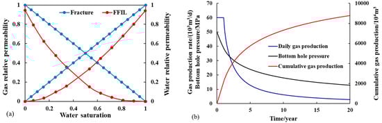 The commercial numerical simulation software tNavigator was used to establish the numerical simulation model, as shown in Figure 8. The shale gas reservoir is divided into the original reservoir volume and the stimulated reservoir volume, which is further divided into three areas: hydraulic fracture, FFIL, and matrix. The horizontal well is 1500 m long and fractured in 20 stages, and the total width of the model is 400 m. The horizontal well was first produced at a constant rate of 6 × 104 m3/d, and then turned into constant pressure production when the pressure dropped to 5 MPa. The gas–water relative permeability curves in the hydraulic fracture and the FFIL, and the production curves, are shown in Figure 9. The values of the other parameters in the numerical simulation model are shown in Table 2.