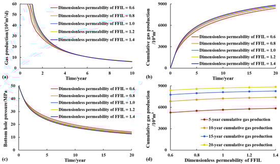 Effect of permeability of FFIL on gas production and pressure. (a) Effect of dimensionless permeability of FFIL on daily gas production; (b) effect of dimensionless permeability of FFIL on cumulative gas production; (c) effect of dimensionless permeability of FFIL on bottom-hole pressure; (d) cumulative gas production over 5, 10, 15, and 20 years at different permeabilities of FFIL.