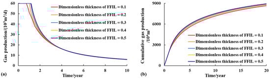 As can be seen from Figure 11, the larger the dimensionless FFIL thickness, the more fracturing fluid retained in the reservoir is used to form microfractures, and the larger the expansion range of the microfractures, which is equivalent to the larger the dimensionless FFIL permeability, the longer the stable production period. The larger the dimensionless FFIL thickness, the longer the stable production period will be, and the larger the cumulative gas production will be during the stable production period; and the higher cumulative gas production, the better the development effect will be. Under the same production time, the greater the dimensionless FFIL thickness, the smaller the increase in cumulative gas production. With the same dimensionless FFIL thickness, the cumulative gas production increases less and less as the production time increases.