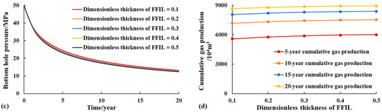 Effect of thickness of FFIL on gas production and pressure. (a) Effect of dimensionless thickness of FFIL on daily gas production; (b) effect of dimensionless thickness of FFIL on cumulative gas production; (c) effect of dimensionless thickness of FFIL on bottom-hole pressure; (d) cumulative gas production over 5, 10, 15, and 20 years at different thickness of FFIL.