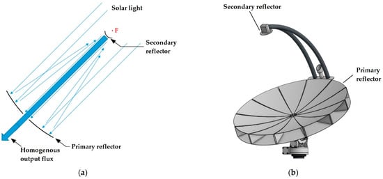 In the context of an analysis conducted over a former Portuguese Patent Pending Request [17], our research group was able to demonstrate in previous works [4,18] that theoretically quasi-homogeneous solar flux distribution can be obtained by means of a double reflection using two paraboloid-reflecting surfaces when a single focal point is shared between those two paraboloids. The second paraboloid can be convex and positioned before the focal point (as in Figure 1) or concave and positioned after the focal point [4,18]. Such a system draws parallels from the Cassegrain reflector that is widely used in optical and radio astronomy [19], with the difference being that the parabolic secondary reflector (as opposed to a hyperbolic one) does not focus light to a point, but produces a uniform light beam.