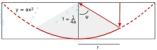The optical behaviour of an ideal reflecting paraboloid (), receiving light rays parallel to its axis (see Figure 3), can be described by its unique focal length (derived in [4]) where a is the curvature, and by its rim angle Ψ (the maximum angle that reflected rays make with the paraboloid axis). The paraboloid projected radius can then be calculated using the equation (derived in [4]):