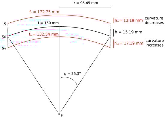 As the projected radius is the same (95.45 mm) for all three paraboloids, Equation (1) can be used again, with the new curvature, to obtain the rim angle Ψ (by trial and error) that gives the required projected radius (95.45 mm) that is smaller for the S− paraboloid (Ψ = 30.9°) and larger for S+ paraboloid (Ψ = 39.6°). All of the geometrical parameters for the design of these three paraboloids are presented in Table 1.