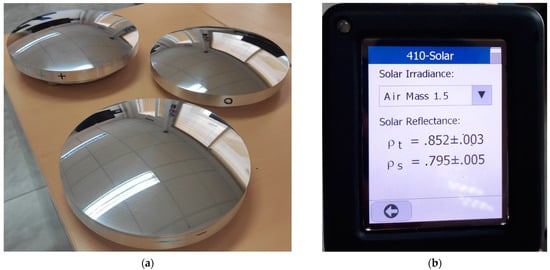 (a) The three secondary paraboloid reflectors, after final polishing; (b) Reflectance measurements on the S0 reflector (close to edge) provided by the SOC410-Solar portable reflectometer from Surface Optics Corp. (San Diego, CA, USA).