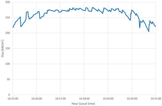 Heat flux was measured using thermo-gauges of the Gardon type (TG1000, from Vattel Corporation, Christiansburg, VA, USA). For taking measurements, one circular-foil heat flux transducer was positioned at various points on the measurement plane, with readings being taken at each point on a square-grid with a 20 mm spacing. The distance from the Gardon thermo-gauge to the reflecting surface depends on the type of measurement being performed and is detailed on the subsequent sections of this article. The Gardon gauges had a flux range of 378.7 kW/m2 and 3508.5 kW/m2 at a full scale (10 mV), depending on the trial type, the shutter opening, and the secondary reflector heat load. Given the nature of these sensors and the large inertia of the heliostat which tracks the Sun, a “saw-tooth” output signal of the Gardon gauge is generally obtained (see example in Figure 6). Therefore, an average of the sensor reading was taken by measuring the heat flux at each point during at least a 10 s period. After the reading, it is necessary to manually command the XYZ working table to position the Gardon gauge to a new measurement site.
