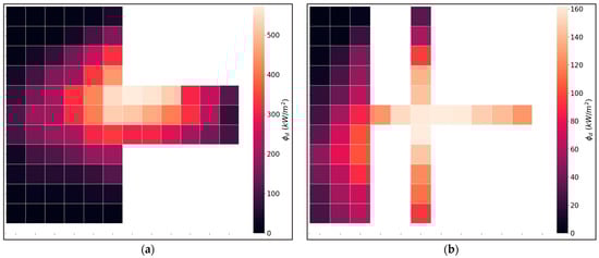 The heat flux distribution was first measured at the focal plane (z = 7800 mm) of the SF60 primary reflector (see Section 2.4) to observe the degree of uniformity of the distribution of the concentrated heat flux. Further measurements at the theoretical position of the S0 secondary reflector (z = 7650 mm, because f = 150 mm) were then performed. The results of these measurements are shown in Figure 7, for both distances. Whole white areas in the images correspond to zones where no measurements were made. We note that, using a single Gardon radiometer, and waiting for enough time to obtain more stable readings, the evaluation of the flux distribution in a 240 mm × 240 mm area (corresponding to 12 × 12 = 144 measurements, see Section 2.4) takes a relatively long time (in excess of 1.5 h) in this large scale, Sun-dependent, facility.