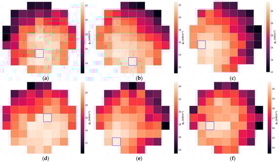 Radiation flux maps for the secondary reflector S0 at various positions along the optical-axis: (a) at z = 7650 − 20 mm; (b) at z = 7650 mm; (c) at z = 7650 + 20 mm; and after rotation by 90°: (d) at z = 7650 − 20 mm; (e) at z = 7650 mm; (f) at z = 7650 + 20 mm. In each map, the highest value of radiation flux is indicated by an outlined square.