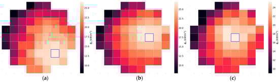 Radiation flux maps for the S0 secondary reflector at z = 7650 mm in different days: (a) day 1; (b) day 2; (c) day 3. In each map, the highest value of radiation flux is indicated by an outlined square.