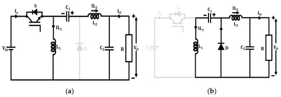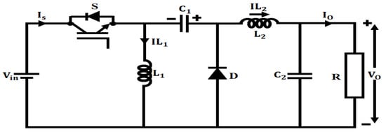 The Luo converter is a high-efficiency buck-boost DC-DC converter that provides a high output voltage with minimal current ripples. The circuit representation of the Luo converter is shown in Figure 2 with the power switch S and the freewheeling diode. The operation of the Luo converter is analyzed by two modes, which are explained in Figure 3.