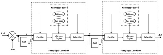 Figure 4 shows the structure of the proposed cascaded control technique consisting of two FLCs connected in a series. The reference control signal from the first FLC drives the second FLC to generate the necessary duty cycle   Δ D command that controls the switching pulses of the converter. The second FLC is designed to minimise distortions, which have a detrimental effect on the output of the Luo converter.