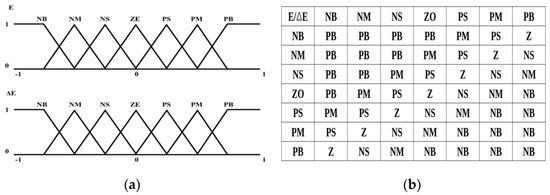 Figure 5a,b illustrates the triangular membership functions of inputs E and Δ E in addition to the CFLC rule base. The rule base is usually represented by fuzzy linguistic variables. For the designed 7 × 7   rule base, the k t h linguistic control rule is given as,