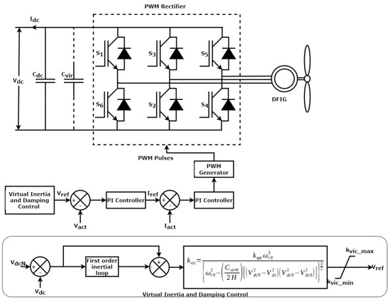 where P in is the active power output of the PWM rectifier, P out is the active power injected into the DC Microgrid, C dc is the dc capacitor voltage, and V dc is the dc bus voltage. During the steady-state operating condition, P in = P out since constant DC voltage is maintained. During unbalanced operating conditions or uncertainties, the variation in P out may occur, leading to either the charging or discharging of the DC capacitor. It results in the reduction of the dc voltage change rate. The wind turbine is a controllable power source and can reduce this dc voltage change rate. It provides additional power through the application of inertia and damping control [32]. The inertial power supplied ( Δ P vir ) by the WECS to maintain the dc-link power balance is represented by the following Equation (24),