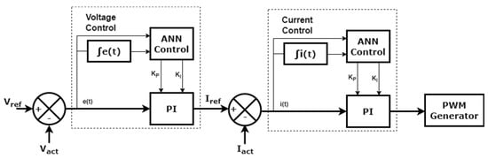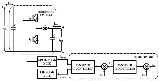Energy Storage Systems (ESSs) are other key constituents in DC Microgrids because they improve power quality, reliability, security, energy balance, and minimise energy losses. It mitigates the reverse flows caused when DER generation exceeds the load, resulting in the reduction of energy losses. When there is an excess energy generation, the ESS stores the appropriate amount of electrical energy and delivers it to the grid and load when there is a need. To attain this, ESS is connected to the DC bus through a bidirectional converter, which avoids the potential risk caused by the direct connection of ESS with the DC bus [28]. In the present work, an ANN-based droop control approach is proposed for ESS to effectively regulate the DC link voltage during normal operating conditions and during insufficient power generation from PV and WECS.